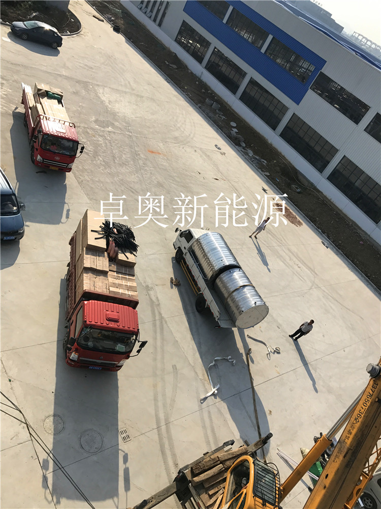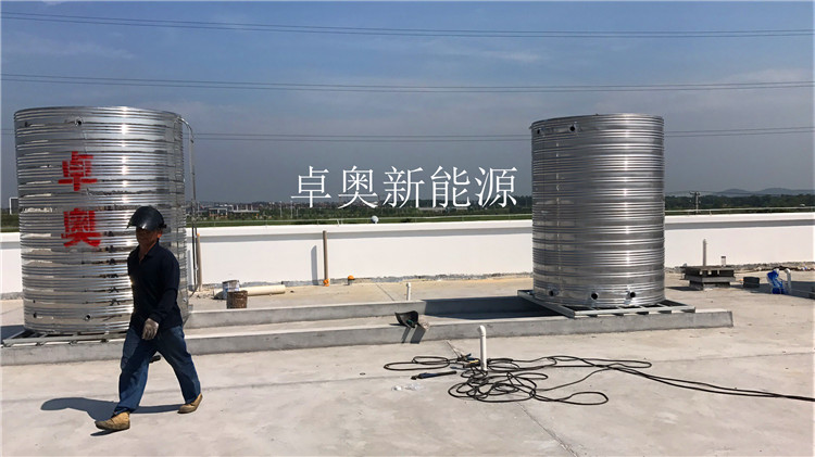 该项目用水量为5吨,我公司为其配置了10组太阳能联箱集热器,使用2台空气源主机。保证24小时提供办公大楼用热水。