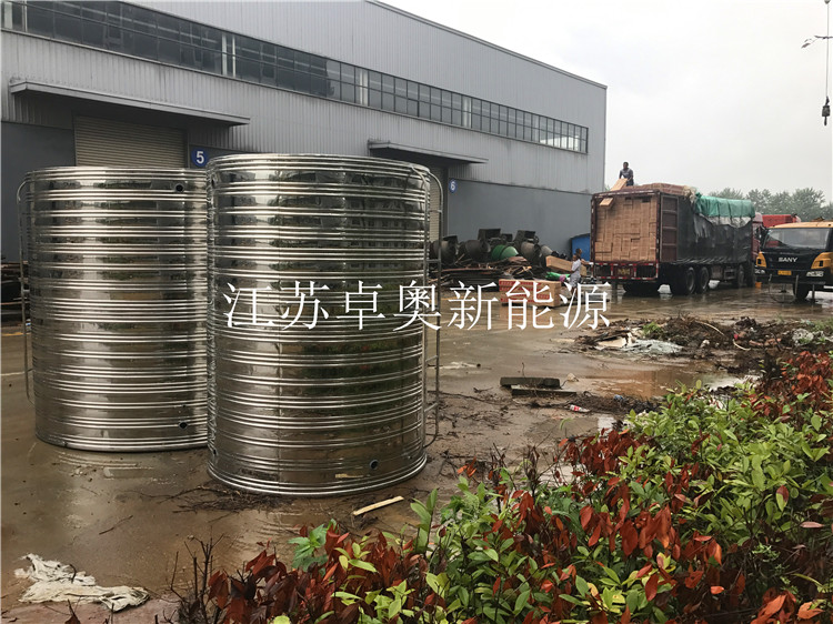 二期为一个10吨水箱,一个5吨水箱,配置了2台10匹空气能热泵,30组太阳能集热器联箱,安装投入使用后24小时提供热水供应。