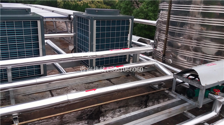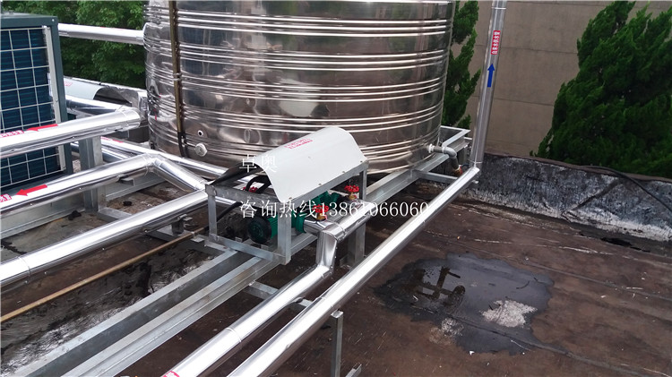 工程明细:18组太阳能集热模块,3台5匹空气能热水机,2个8吨不锈钢保温水箱