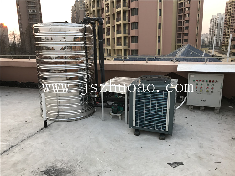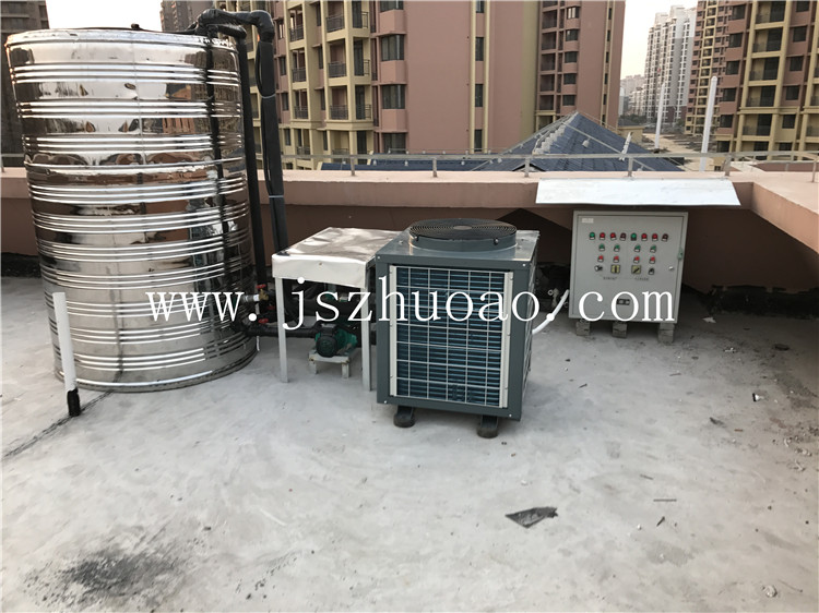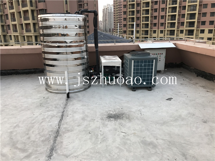 工程介绍:一台3匹商用空气能主机,一台1吨保温水箱