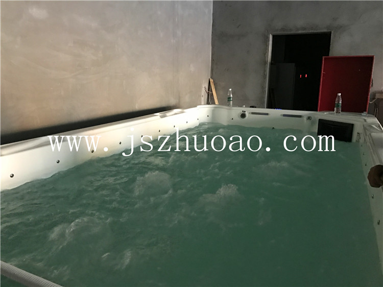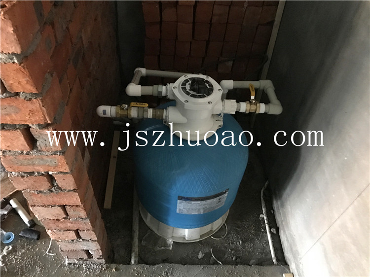 婴儿游泳馆泳池恒温加热系统,池子放水4吨, 配置了一台5匹专用泳池恒温机组进行恒温,保证池子水温控制在40度,另外加装了一套沙缸过滤系统,循环过滤池子中的杂质和毛发。