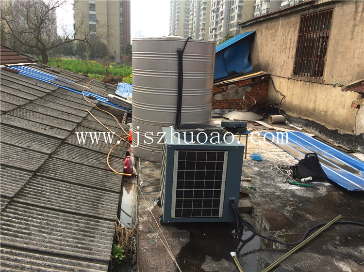 工程介绍:1台5匹空气能,1台3吨不锈钢保温水箱,员工下班洗澡热水55度。